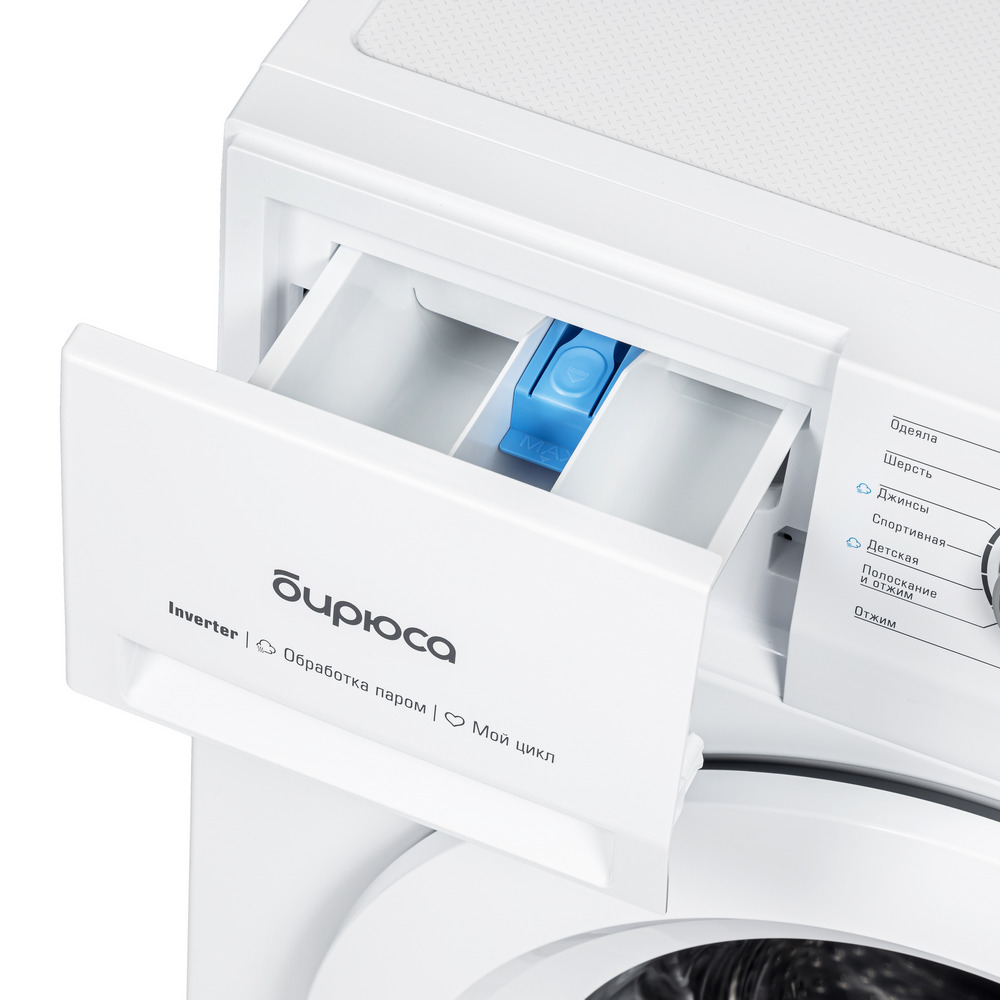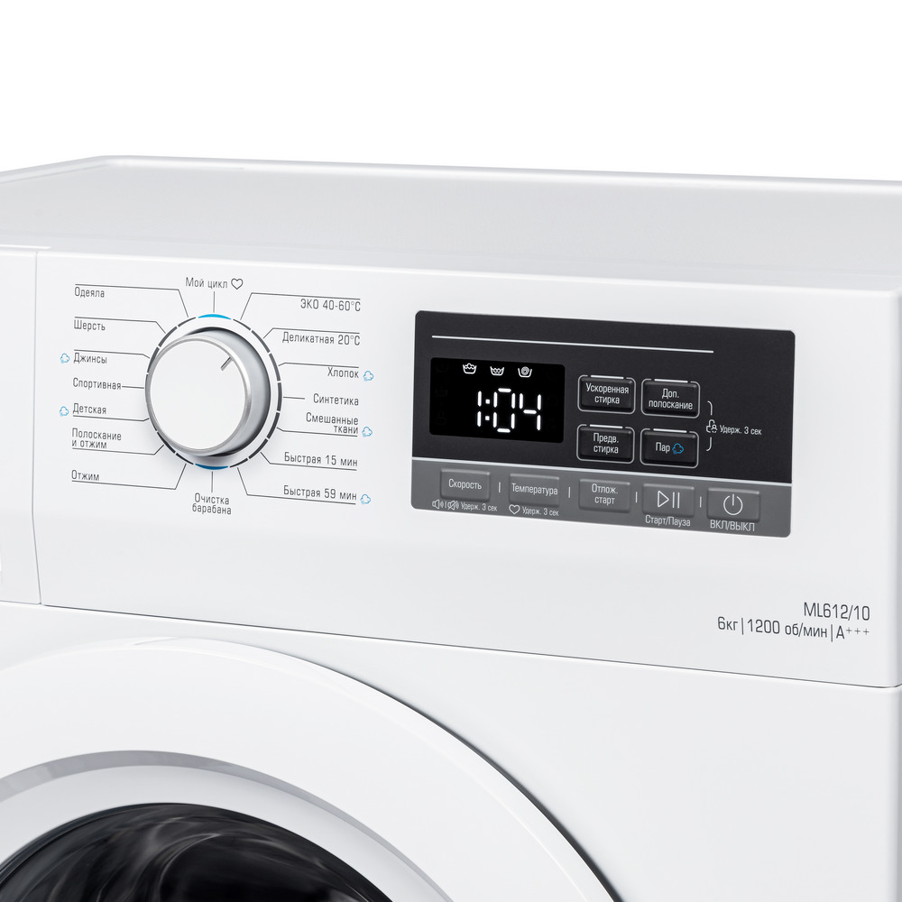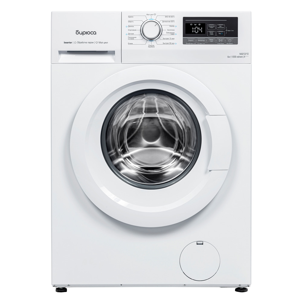 Режимы работы стиральной машины Бирюса WM-ML612/10: хлопок, деликатная 20 ºC, синтетика, смешанные ткани, шерсть, быстрая 59/15 мин, отжим, полоскание и отжим, детская, ЭКО 40-60 ºC, джинсы, спортивная, одеяла.