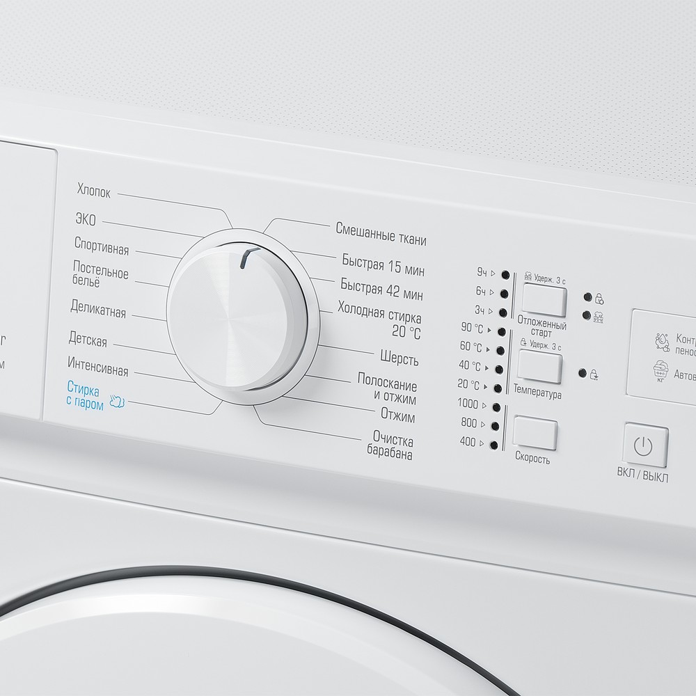 Режимы работы стиральной машины Бирюса WM-SM510/10: хлопок, деликатная, интенсивная, смешанные ткани, быстрая 42/15 мин, холодная стирка 20°С, отжим, шерсть, полоскание и отжим, очистка барабана, ЭКО, детская, постельное белье, спортивная, стирка с паром.